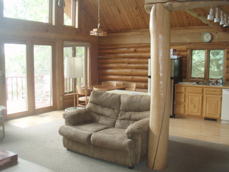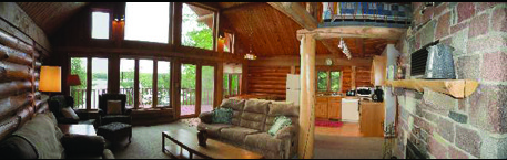 This impressive log home is constructed of native wood, complete with a massive granite fireplace and prow deck overlooking the lake. This cabin is three levels with two bedrooms, a loft, a studio and three bathrooms. Sleeps twelve. Bedroom 1 (main level) has a queen bed. Bedroom 2 (main level) has two single beds. The loft (upper level) has two single beds and a queen bed. The studio (lower level) has two double beds. This cabin has two kitchens; 1 on the main level and 1 on the lower level. This cabin has air conditioning.