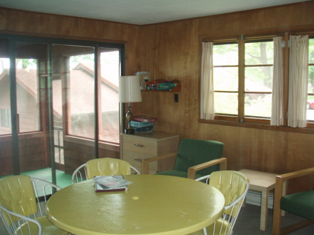A two-bedroom cabin with glass doors that open into a large, screened porch. The master bedroom has a king size bed and faces the lake. Sleeps six. Bedroom 1 has a king bed. Bedroom 2 has two sets of bunk beds (four beds total). This cabin has one bathroom.