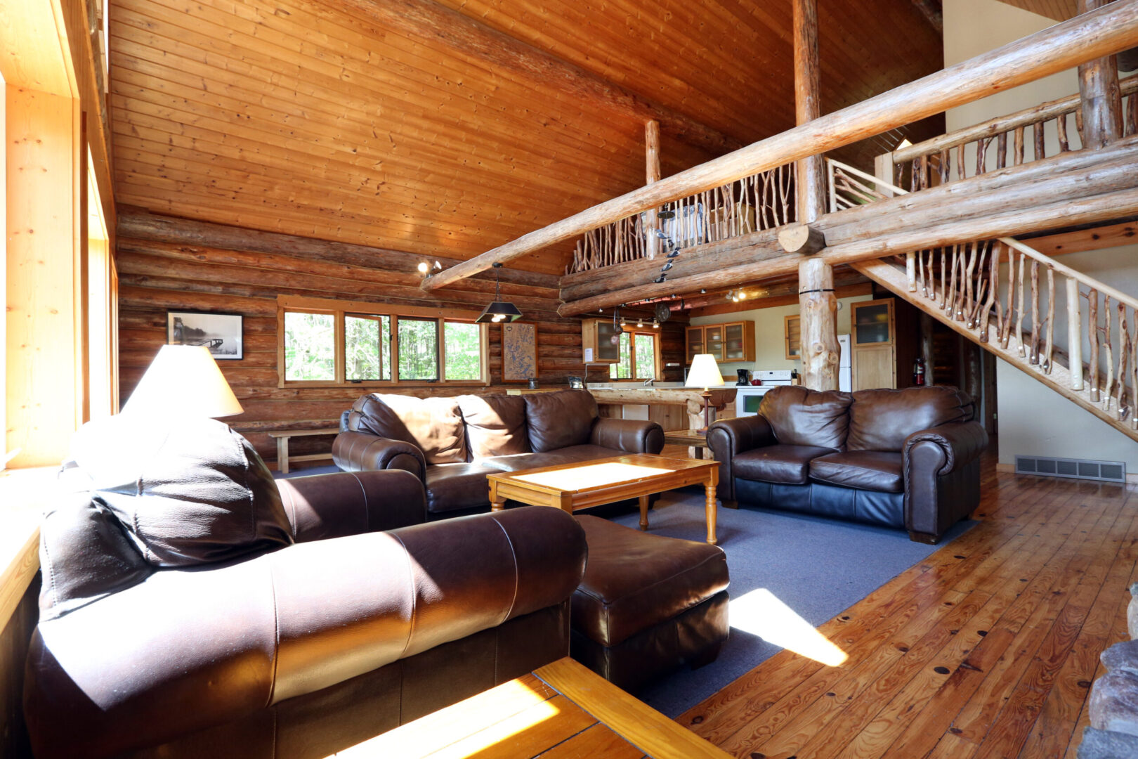 The rustic charm of a large log home will be yours to enjoy in this three-bedroom, two-bath cabin overlooking the lake. Features a loft bedroom, native-wood throughout, fireplace and private dock. Sleeps 10. Bedroom 1 has a king bed. Bedroom 2 has a king bed. The loft has four single beds and a queen bed. This cabin has air conditioning.